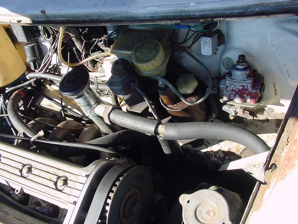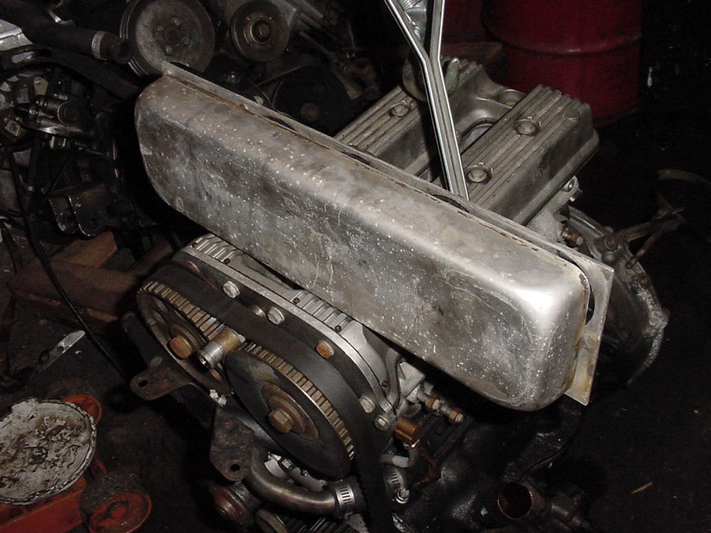 The Mini thermostat is mounted in its head, the BMW's is mounted in its block, so I ended up fabricating my own thermostat housing by capturing a thermostat between the compression nuts of some 1-1/4 plumbing sink pipes. I think the actual thermostat was from a Renault. The headers were about the only used BMW part I incorporated in the project. They were after market Luffmeister porcelain coated pipes. If I had mounted them the way they were made they would have pointed straight through the right side inner fender. I ended up cutting them into numerous pieces and welding them back together to get them routed downwards. I remember it was not easy gas welding glass coated metal. At the time I could not afford the BMW fuel injection components. A friend of mine had a set of carbs off a Honda 650 Nighthawk. I had to extensively modify the linkages and fuel pipes so the carb spacing matched up with the BMW head. The head is set up for direct port electronic fuel injection. It would be really nice to get that setup going. The carbs blocked access to the standard Mini dipstick so the one you see is from some Oldsmobile I found in a junkyard. The BMW head did not have any provision for an oil filler cap so I brazed a section of pipe onto a fuel pump blanking plate and brought that out top with a plumbing supply dishwasher downspout. It was topped with a Toyota rubber oil cap. The air cleaner setup took a long time to figure out. I ended up fabricating a plenum chamber from some aluminum plate ands a 16" long loaf bread pan. The plenum was connected to a Honda CRXsi remote air cleaner box through a 3" smooth bore RV sewage hose. It looked pretty factory despite the hodgepodge of components.