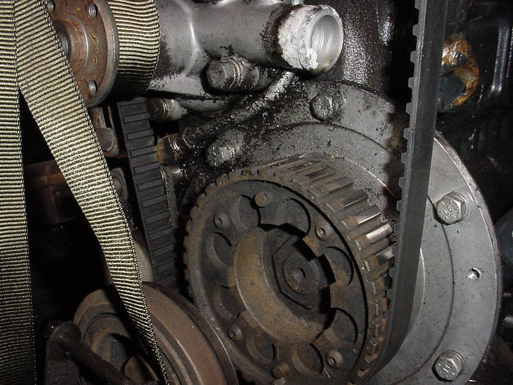 Both the Mini and the K bike use an oiled chain drive system. A custom chain drive didn't seem like a simple affair especially considering the Mini's water pump location, right smack in the middle of it all. A belt drive system seemed much more achievable. I had a Mini after market belt drive kit which I utilized primarily for it's oil sealing plate. The cog wheels I used are inexpensive Ford Racing parts from their 2.3L SOHC engines and have numerous timing adjustment key-ways to allow for pretty simple cam timing adjustments. The head has an aluminum end plate I fabricated by hand with 2 oil seals installed. The camshafts are brought out through those oil seals with short extension shafts made from discarded Ford 2.3L camshafts. A tensioner, also from a Ford 2.3L engine was mounted to the front engine plate to complete the package. The belt is from a VW Rabbit. This all worked out very well as I was able to use a stock water pump, stock fan and stock radiator.